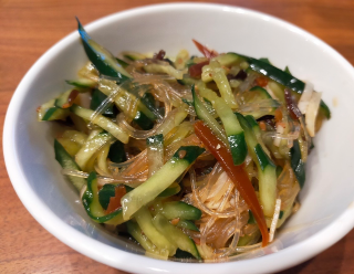 キュウリの冷たい欠片を押しこむと、春雨がきゅっと締まって、熱と冷たさが絡み合う